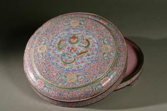 Descriptionround two part lidded cake container; floral design with European looking dragon figure on the top
