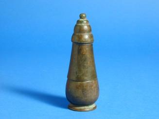 Descriptiontear shaped pot with rimmed body and tall lid with 3 ridges and knob at top