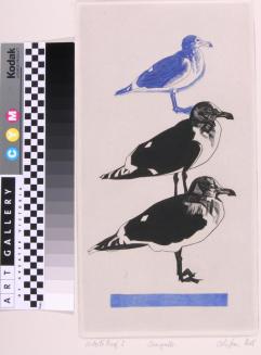 Descriptionprofile of three seagulls, one on top of the other in black and blueStatus