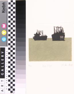 Descriptiontwo black ships in background, foreground in olive greenStatus