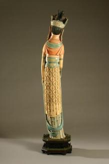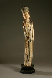 Descriptionstanding figure of Guan Yin with high chignon and crown with six openwork panels backing small images of the Buddha on double lotus bases rising from cloud collars. Figure has long earlobes and earrings with tassels extending onto shoulders and holds a lotus stem in one hand. The end of a scarf is draped over its shoulders and there is elaborate relief jewelry extending down the chest and robe. Details are tinted. Custom stand has silver inlay.Status