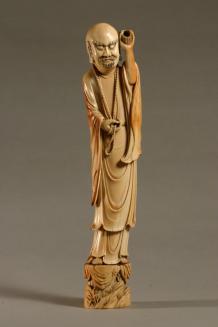 DescriptionFigure of Bodhidharma standing on a rocky base, holding his shoe at head level and the other hand at waist level and holding a long string of beads that extends from his neck.Status