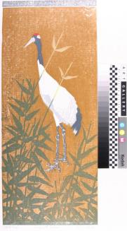 Descriptionprofile of a standing white crane with red forehead, in a bamboo groveStatus