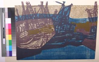 Descriptiontugboats, larger one named "fitzhugh,Vancouver BC in brown, smaller abstracted boats on the rightStatus