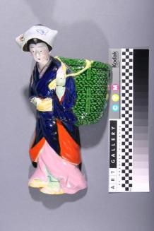 DescriptionBanko ware wall vase, woman with basket on her backStatus