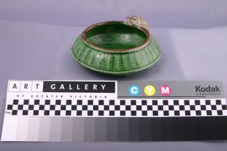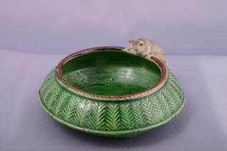 Descriptiongreen enamel dish with grey cat on rim; herringbone pattern on shoulder and body, brown gadroon pattern on rim;