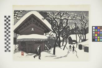 Descriptionwinter scene in Aizu, house with bare trees, man walking and two skiers;Status