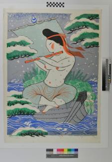 DescriptionImage of a bare chested owman seated on a sail boat and playing a flute.Colour: green; blue;grey;orange;black