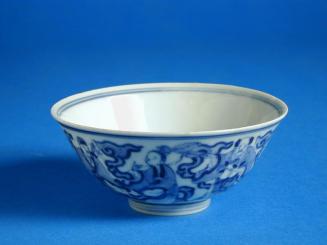 Descriptionbowl has underglaze blue design of three Daoist immortals beneath a pine; exterior of bowl has eight immortals on waves & amid cloudsStatus