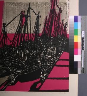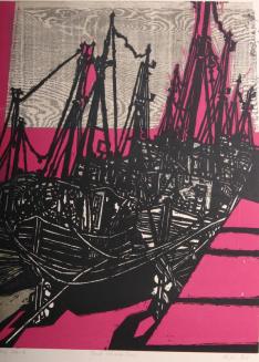 Descriptionboats docked along the quay, one large image in foreground and smaller ones behind, the sea and dock are coloured with a bright pink