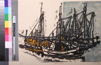 Descriptionboats in open water; the right background is coloured olive green and the left background is uncoloured, an orange boat is on the left