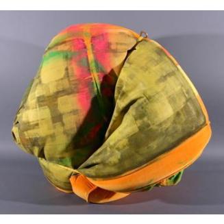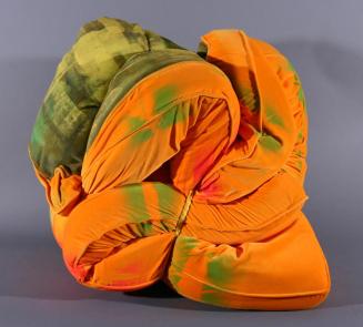 Descriptionred velvet cushion has been folded, tied with rope, and painted.