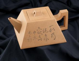 DescriptionTeapot is square at the base with four flat sides that taper inwards towards the flat top. There is a four sided tapered spout on one side and an angular handle on the other. A square shaped fitted lid with an angular knob is at top centre. Calligraphy is incised on one side and branches and a flower on the other.Status