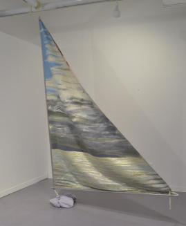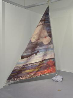 Descriptiontriangular sail is a patchwork of fabrics enclosed within nylon mesh. One side is abstract with fabrics in shades of blues, whites, greys and metallics, while the other is comprised of dotted fabrics in purples, oranges, blues and yellow with the inclusion of an upside down strapless evening dress at the apex; hollow aluminum poles at 2 sides within a plastic gusset; ropes threaded through the poles;