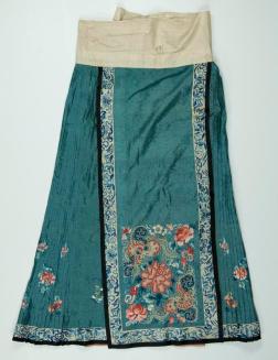 DescriptionGreen silk brocade skirt has front and back panels that are embroidered in floral and butterfly motifs in rose, blue, and white. There are two side sections with fine pleats that have been tacked together and with occasional small embroidered motifs. A blue and white embroidered decorative band runs along the hem and around the front and back panels. The wrap around skirt has a wide cotton waist band.Status