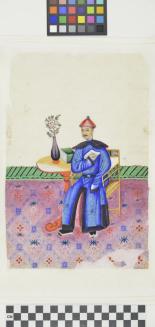 DescriptionSeated man with blue robe, vase with blossoms on table.Status