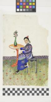 DescriptionSeated man with a blue robe. There is a green patterned floor, a black stool, and an orange pedestal table with green vase.Status