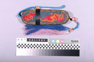 DescriptionOblong two-part glasses case with a cord attached to the bottom half and threaded through the centre of the top. Cord at the top has a sliding ceramic bead to secure the two halves. Cord at the bottom has 2 tassels and a single decorative ceramic bead. Case is embroidered on both sides with a gold and black geometric border with a blue geometric patterned interior and two large bat motifs in orange, red and white.Colour: black;gold;blue;red;orange;white;mauve
