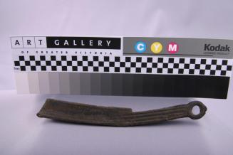DescriptionPerforated on one end with raised parallel ridges on 2 sides of handle; raised pattern (characters?) on 2 sides of blade.Status