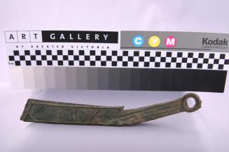 DescriptionPerforated on one end with raised parallel ridges on 2 sides of handle; raised pattern (characters?) on 2 sides of blade.