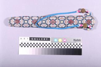 DescriptionNarrow elongated case, open at one end with a loop of cord attached to either side of the opening. Blue cord has 2 large knotted metallic beads and embroidery. Case is covered with a grid-like petit point design in black, blue, maroon and yellow on white. It has blue silk lining.Colour: black;blue;maroon;yellow;white