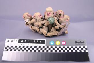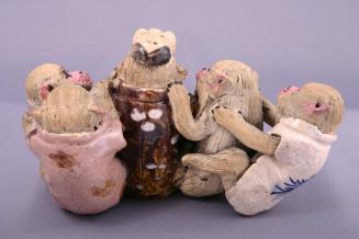 DescriptionGroup of five seated monkeys, centre one holds a green fruit and has a mask on it's head. They have pink faces and jackets in beige and brownsColour: brown;pink