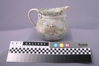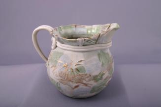 DescriptionCreamer is made from marbled clay in beige, green, white and blue, in a tapestry pattern. There is coil work around the neck and forming the handle. Clear glaze on interior and gold on rimColour: beige;green;white;blue;gold