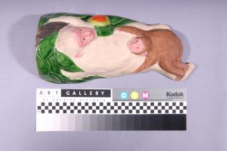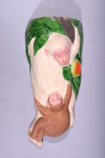 DescriptionElongated wall vase with 2 monkeys, one beige and the other brown, greenery and a yellow and orange fruit. Flat on one side with perforation at top.Colour: brown;green;yellow;orange