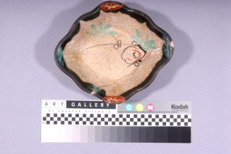 DescriptionDiamond shaped dish with undulating rim edges outlined in a black glaze. Overall glaze on interior and exterior is crackled white with a beige overglaze. There are enamel floral and leaf designs in green, black, red and yellow on rim and interior.Colour: beige;black;red;green;yellow