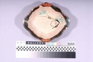 DescriptionDiamond shaped dish with undulating rim edges outlined in a black glaze. Overall glaze on interior and exterior is crackled white with a beige overglaze. There are enamel floral and leaf designs in green, black, red and yellow on rim and interior. Sits on an uneven base.