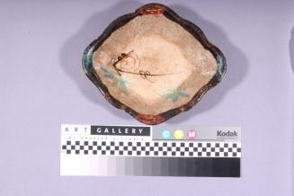 DescriptionDiamond shaped dish with undulating rim edges outlined in a black glaze. Overall glaze on interior and exterior is crackled white with a beige overglaze. There are enamel floral and leaf designs in green, black, red and yellow on rim and interior.Colour: beige;black;red;green;yellow