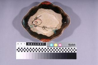 DescriptionDiamond shaped dish with undulating rim edges outlined in a black glaze. (Black border is more pronounced than the rest of the set.) Overall glaze on interior and exterior is crackled white with a beige overglaze. There are enamel floral and leaf designs in green, black, red and yellow on rim and interior. Sits on an uneven base.Colour: beige;black;red;green;yellow