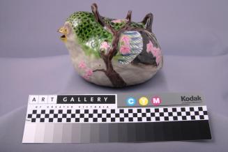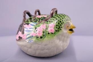 DescriptionQuail shaped teapot has a open yellow beak for the spout and green and black feathers on head and upper back. Wings at sides are blue and white. Brown branches form the 2 handle mount and lid knob. Pink flowers scattered at sides.