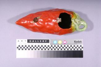 DescriptionVase in the shape of a long red pepper has an opening on front near top and a flat back with a perforation. There is a green stem at top, a mouse peeking over the edge of the opening and a snail on the lower front.Colour: red;green;brown;grey
