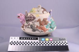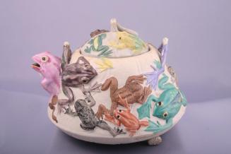 DescriptionLarge grey teapot with raised relief of multi-coloured frogs over surface. A frog with an open mouth forms the spout. There are two loops for handle mounts.