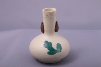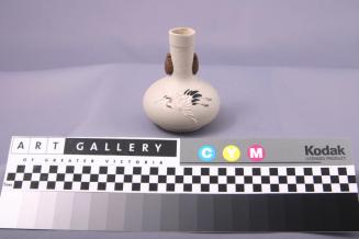 DescriptionSmall rounded vase with tall narrow neck and small foot. Grey clay with glazed design of a crane on one side and 2 raised designs of flies on neck.
