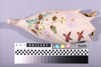 DescriptionBeige wall vase is bud shaped with petals open at one end and pointed and curved at the other. One side is flattened and perforated. Front surface is decorated with flowers and birds in coloured enamels.Colour: beige;mauve;green;brown;blue;yellow