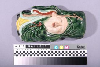 DescriptionVase is in the shape of the standing figure of the God of Longevity. Figure has a flowing green robe that covers the top of his head which is open at the top. He is bearded, smiling and holds a staff in his right arm proper; a yellow skirt shows at bottom. The back is flat and unglazed.Colour: green;yellow