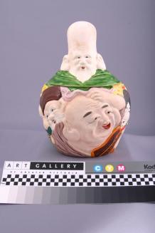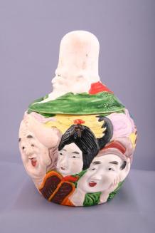 DescriptionRounded humidor slightly tapers to base and has raised relief multi-coloured depictions of the Seven Lucky Gods. Tall bald head of one god forms the knob on the lid. Lid is hollow and has a sponge inside.Colour: multi-coloured