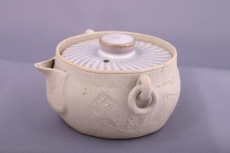 DescriptionSmall round unglazed white teapot with spout and two double rings at the sides. Replacement lid is glazed with spiral design and a flat knob in centre. Outside of pot has various seals impressed into it as well as decorative designs incised on to it.Colour: white