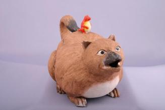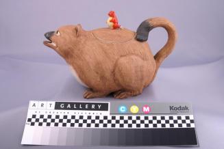 DescriptionTeapot in the shape of a badger; head with open mouth forms the spout and the tail loops into a handle. There is a small red badger on lid for the knob.