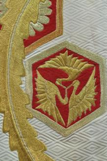 Descriptionwedding robe with a design of chrysanthemums & phoenix; metallic cloth lining; satin stitch embroidery; silver fail couching on silk twillStatus