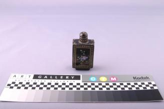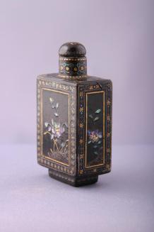 DescriptionLac burgaute black rectangular bottle with a rectangular recessed foot and a straight neck. Mother-of-pearl and gold flower images are framed on four sides. Stopper is of the same material with a single flower on top.Colour: black;gold;blues