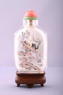 Glass Snuff Bottle Painted Inside with a Bird, Blossoms, Cauldron and Corroded Rock
