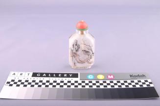 DescriptionInside painted glass bottle is rectangular with facetted shoulders and sides, straight neck and tapering chamfered footrim. Inside image consists of a bird on a blossoming branch next to a corroded rock on one side and with a sprig of plum blossom next to a cauldron on the other side. Top of stopper is rounded pink material with a ring of green jadeite at its base and small clear stone in centre. Body is a flattened rectangle with bevelled shoulders and bottom sides. It has a small recessed foot.