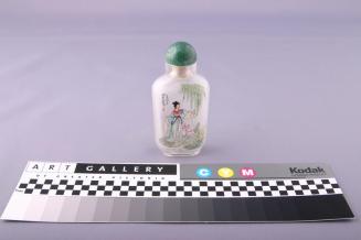DescriptionClear glass bottle has a roughly rectangular body with rounded shoulder and a short base. There is an image of a maiden on a large lily pad and an inscription at top left, on one side. Other side has a maiden with a koto beside a tree and rock. Stopper is green jadeite and rounded.Status