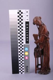 DescriptionMaiden in a flowing robe, leans on a table with mirror in her hand and head turned to the side.Colour: brown