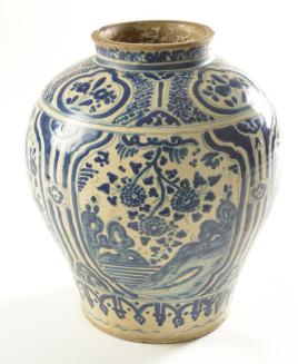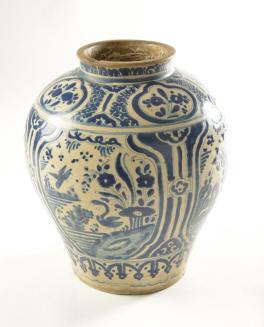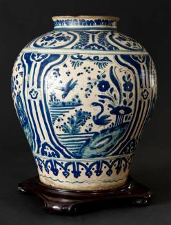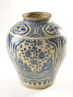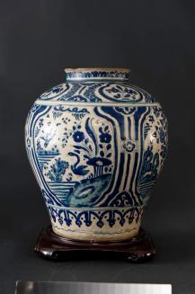 DescriptionBaluster shaped vase has rounded shoulders that narrow towards the base. the neck is short and straight with a slight flared and flattened rim. There is a cream coloured glaze overall on the interior and the exterior (excluding the rim). The exterior glaze is decorated in blue with patterns and designs including birds and florals.Colour: blue; white