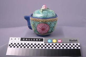 DescriptionSmall hexagonal shaped teapot with no handle and overall enamel glaze in blue, green, pink and yellow. There is a decorative yellow band with spirals around the top edge and medallion shapes filled with decorative motifs and bamboo on the lower body. The spout and rim are plain blue. The lid has two flower buds as a knob..