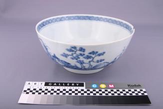 DescriptionRounded sides with a small straight foot. White glaze with underglaze blue design of a landscape on exterior and a geometric band on interior at rim.Colour: blue;white